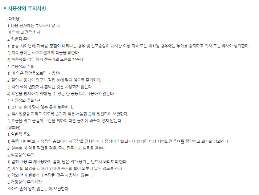 우리가 약을 사용할 때는 주의 사항을 잘 살피고 사용해야 합니다. 특히 눈앤점안액을 안구에 직접 넣는 방식이므로 더욱 주의를 해야 합니다. 사용 중 조금이라도 이상 증상이 나타나면 바로 사용을 중지하고 전문의와 상담을 하시는 것이 좋습니다.