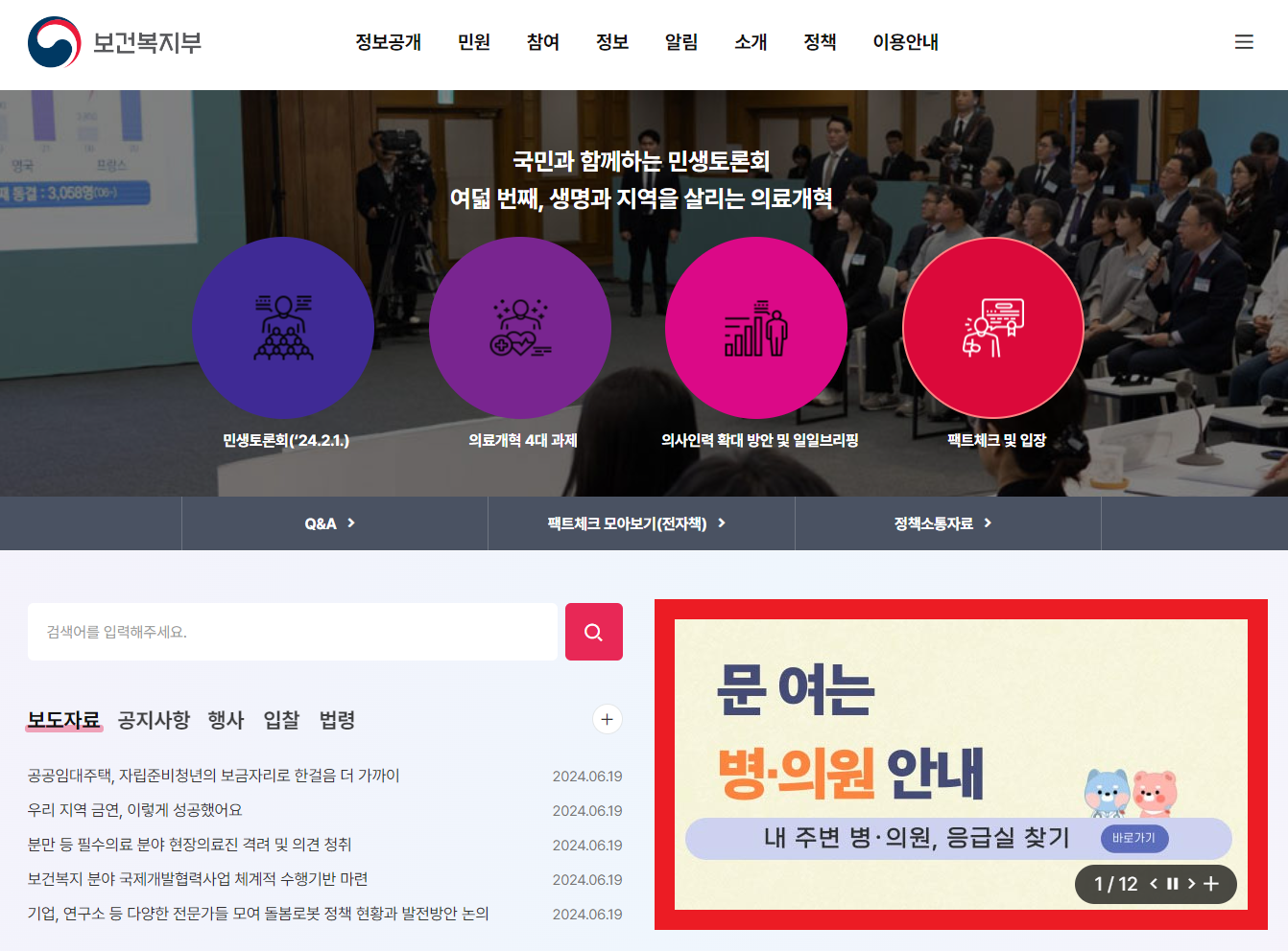 비상진료 병의원 안내는 보건복지부를 통해서도 접속하실 수 있습니다. 아래 링크에서 바로 접속하실 수 있습니다.