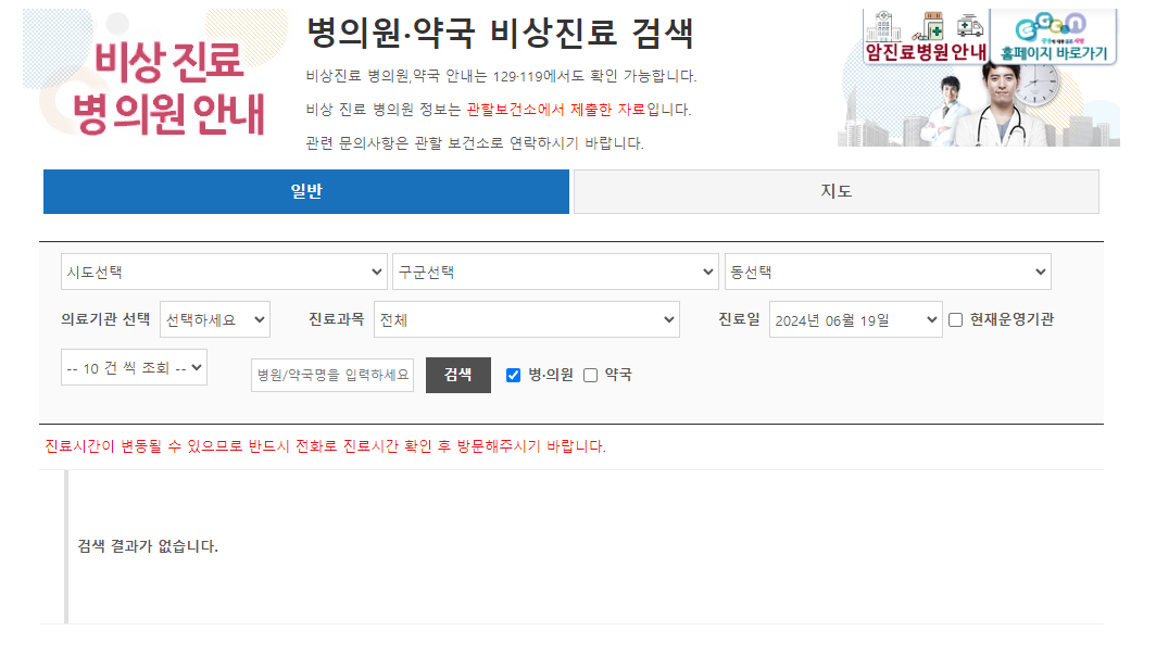 거주하시는 시도, 구군, 동 선택하시고 원하시는 의료기관, 진료과목 선택하시면 바로 확인하실 수 있습니다.
